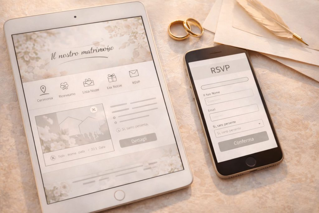 Oltre alla sua funzione pratica, il sito del matrimonio ha anche un importante valore estetico e narrativo. Può essere progettato seguendo lo stesso stile grafico degli inviti, del save the date e degli altri elementi della wedding stationery, creando una continuità visiva tra tutti i materiali del matrimonio. Colori, tipografie, illustrazioni e fotografie contribuiscono a definire l’identità dell’evento e a trasmettere agli invitati l’atmosfera scelta dagli sposi.
